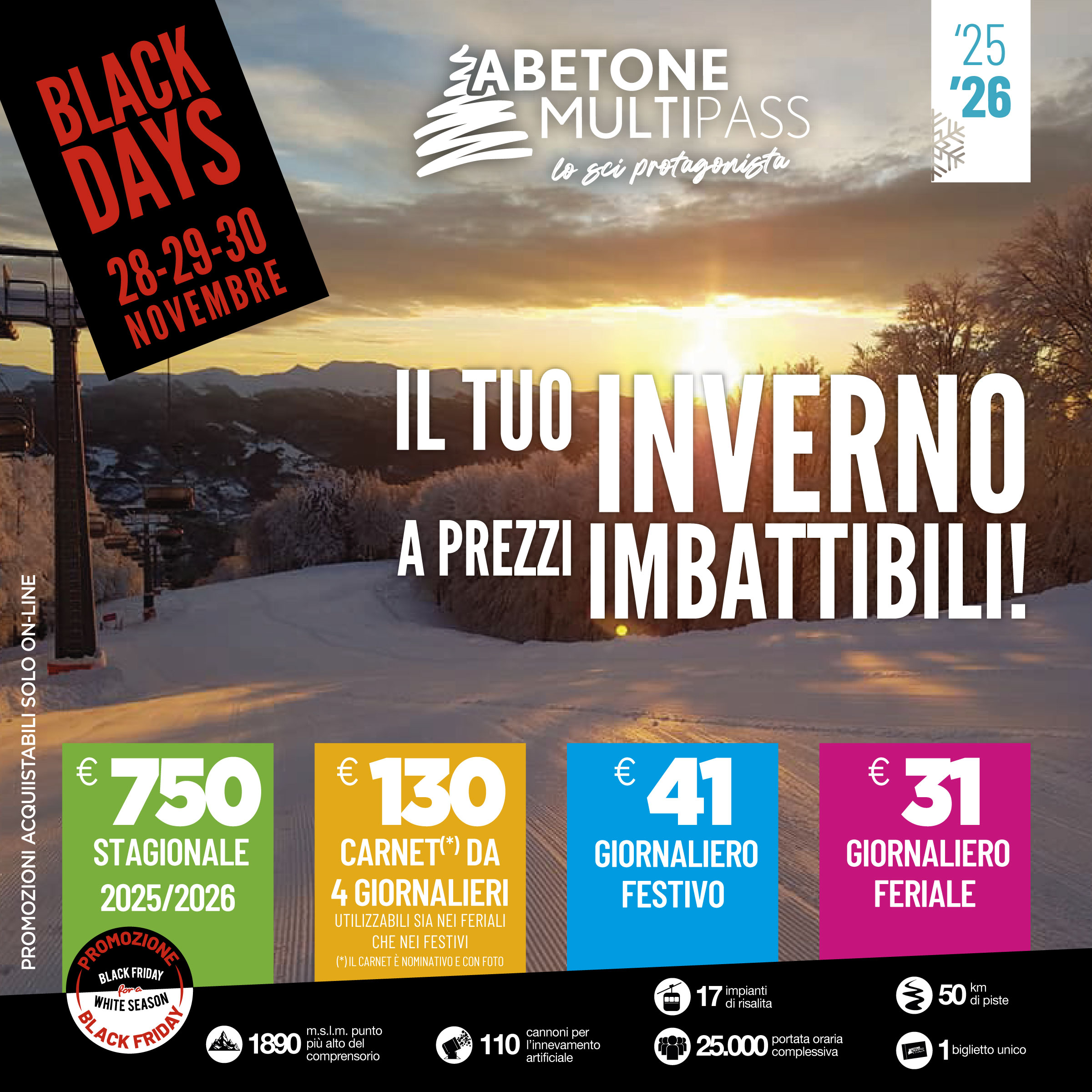 Il 28, 29 e 30 novembre SOLO ON LINE sul nostro sito alla sezione Shop on line, potrete acquistare a prezzi scontati giornalieri feriali e festivi, i carnet nominativi da 4 giorni e lo stagionale. Tutti i biglietti sono validi per l’inverno 2025/2026.
