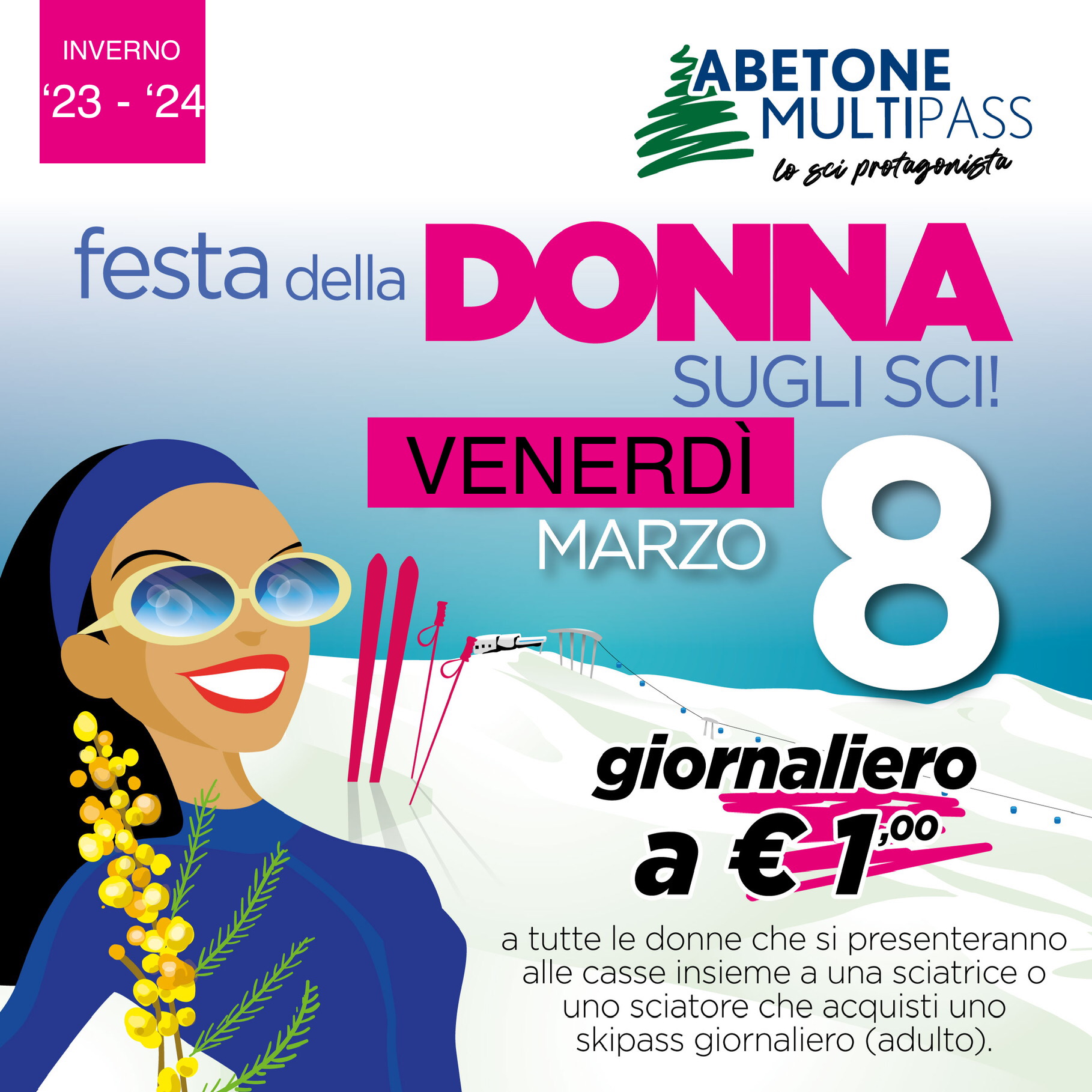 Anche quest'anno tutte le donne che si presenteranno alle casse con una sciatrice o uno sciatore che acquisterà uno skipass giornaliero adulto avranno diritto allo skipass giornaliero a 1 euro.